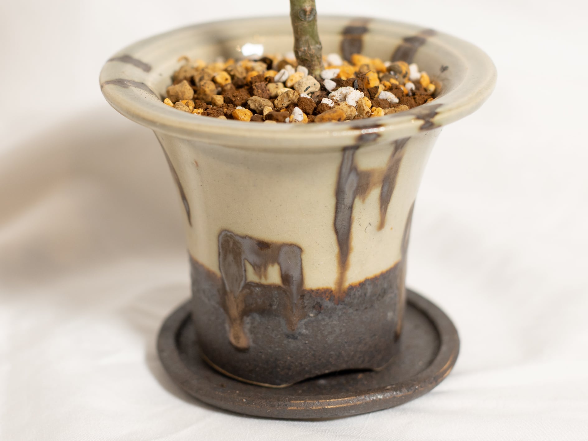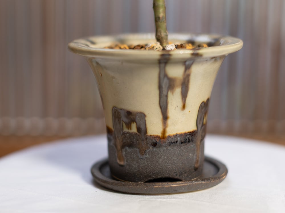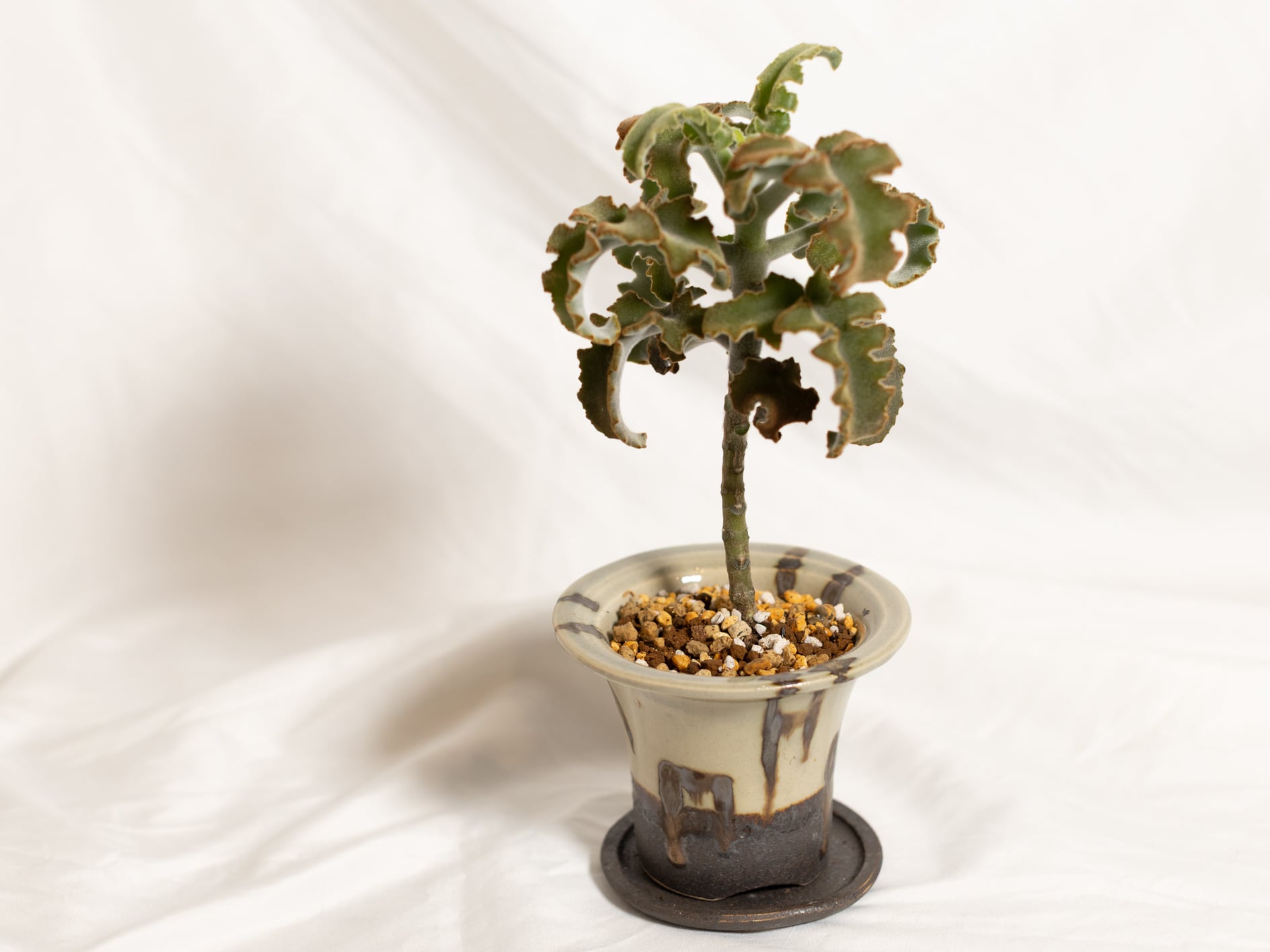 本来は葉が密集する植物ですが、あえて下葉を間引いて幹を見せることで、この万年青鉢風の和鉢に似合う、盆栽のような凛とした樹形に仕立てました。